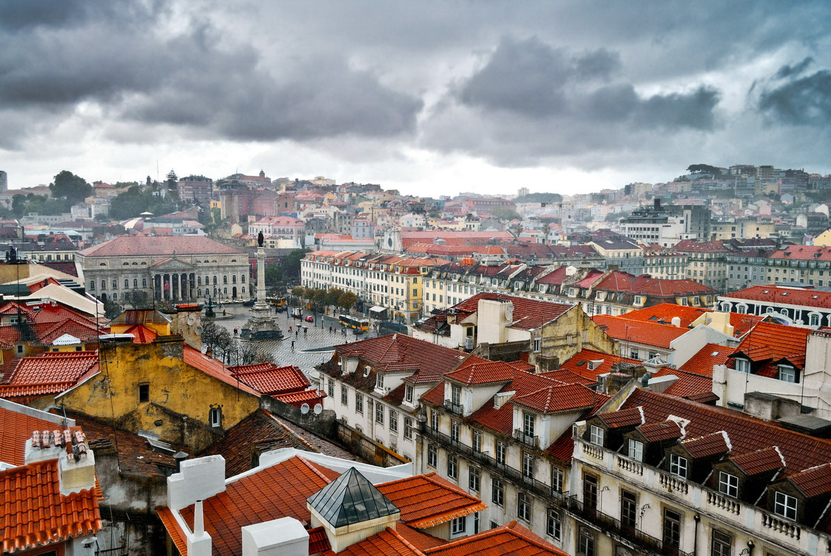 Rossio square with fountain located at Baixa district in Lisbon, Portugal
