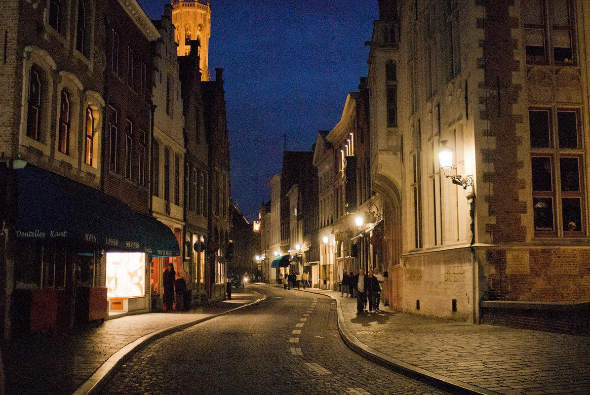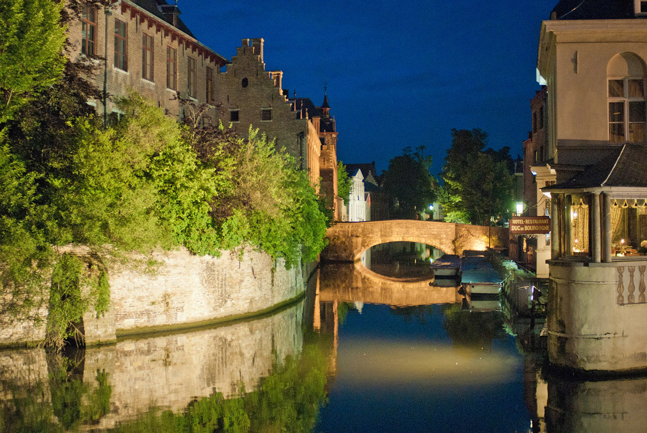 One of numerous canals in Bruges at night, Belgium